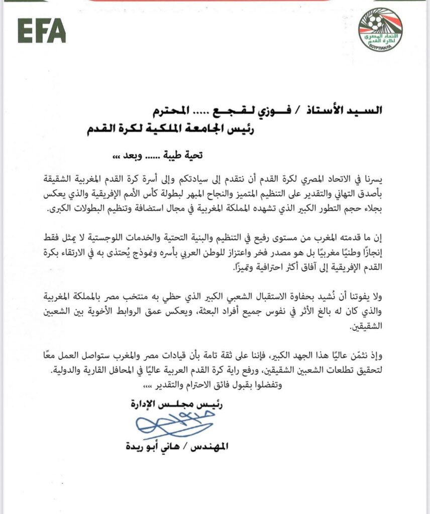 في خطوة وُصفت بأنها توضيح رسمي وحاسم، وجّه الاتحاد المصري لكرة القدم رسالة شكر وتقدير إلى الجامعة الملكية المغربية لكرة القدم، أشاد فيها بالتنظيم المحكم والاستقبال الشعبي المتميز الذي حظيت به بعثة المنتخب المصري بالمملكة المغربية، وذلك على خلفية الجدل الذي أثارته تصريحات مدرب المنتخب المصري حسام حسن.