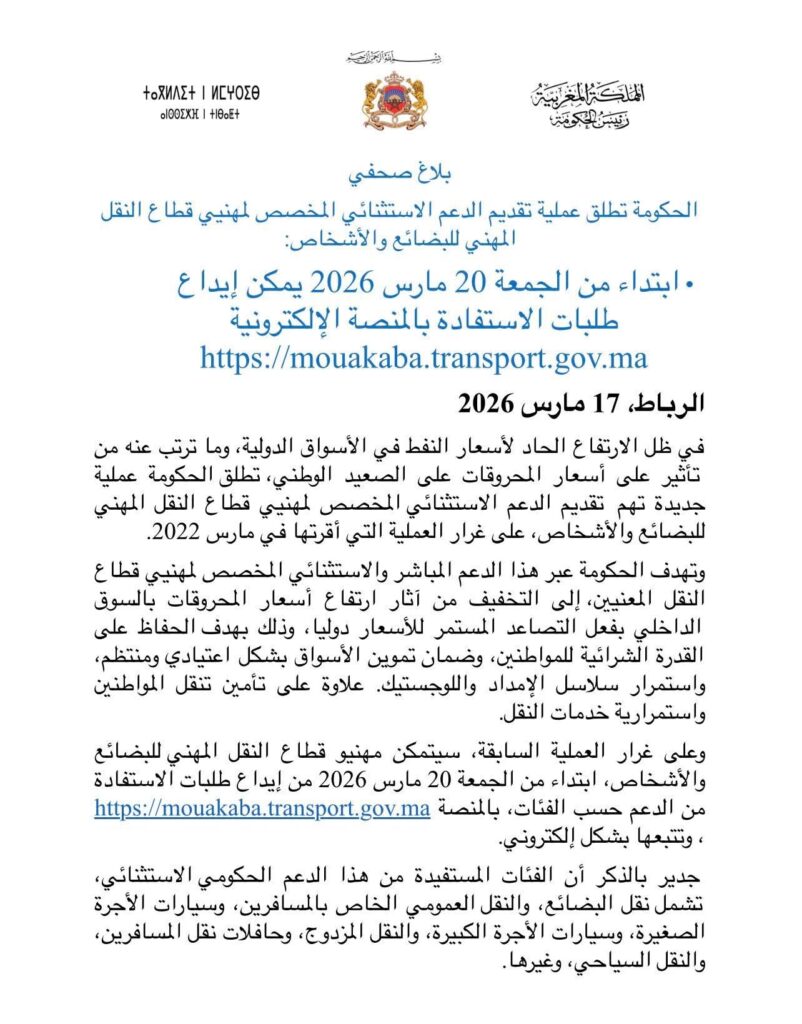 في ظل الارتفاع المتواصل لأسعار المحروقات على الصعيد الدولي، وما يترتب عنه من انعكاسات مباشرة على كلفة النقل وأسعار السلع الأساسية، أعلنت الحكومة عن إطلاق عملية جديدة لتقديم دعم استثنائي لفائدة مهنيي قطاع النقل الطرقي، بهدف الحفاظ على استقرار أسعار نقل المواطنين والبضائع.