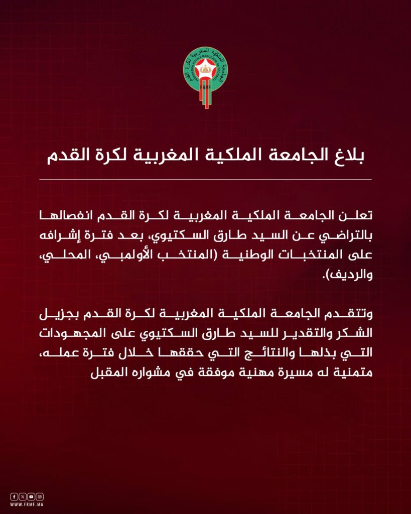 أعلنت الجامعة الملكية المغربية لكرة القدم، في بلاغ رسمي، عن إنهاء ارتباطها بالمدرب المغربي طارق السكتيوي، وذلك بعد فترة أشرف خلالها على عدد من المنتخبات الوطنية، من بينها المنتخب الأولمبي والمحلي والرديف.