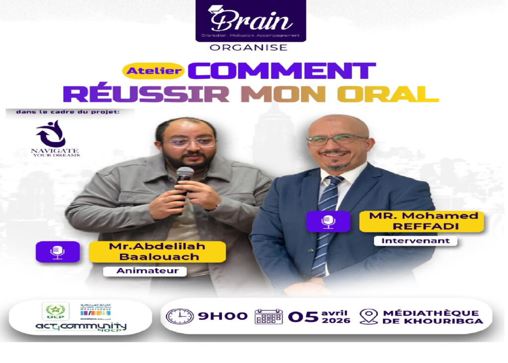 ينظم مركز «براين»، بتنسيق مع الخزانة الوسائطية (م ش ف) بخريبكة، ورشة تدريبية تطبيقية مجانية تحت عنوان: «كيف أنجح في امتحاني الشفوي»، وذلك يوم الأحد 5 أبريل 2026، ابتداءً من الساعة التاسعة صباحاً، بفضاء الخزانة الوسائطية.